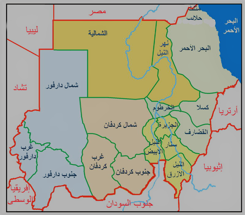 ولاية الخرطوم (الخرطوم )، ولاية الجزيرة (ودمدني)، ولاية شمال كردفان (الأبيض)، ولاية جنوب دارفور(نيالا)، ولاية جنوب كردفان (كادقلي)، ولاية شمال دارفور (الفاشر)، ولاية كسلا (كسلا) ، ولاية شرق دارفور (الضعين)، ولاية النيل الابيض (ربك)، ولاية البحر الأحمر (بورتسودان)، ولاية القضارف (القضارف)، ولاية سنار (سنجة)، ولاية نهر النيل (الدامر)، ولاية النيل الأزرق (الدمازين)، ولاية غرب دارفور (الجنينية )، الولاية الشمالية (دنقلا)، ولاية وسط دارفور(زالنجي)، ولاية غرب كردفان (الفولة).